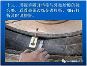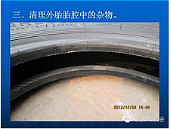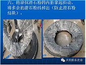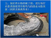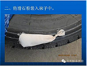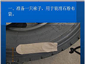 ??1、準(zhǔn)備一只襪子,用于滑石粉???2、將滑石粉裝入襪子中。?3、清理外胎胎腔中的雜物。??4、確認(rèn)內(nèi)胎墊片與螺母是否擰緊。5、裝好滑石粉的襪子袋,進(jìn)行拍打內(nèi)胎表面使滑石粉均勻的涂抹在內(nèi)胎表面(潤滑及隔離作業(yè))。??6、將涂抹滑石粉的內(nèi)胎拿起來抖動,將多余的滑石粉抖掉出(防止滑石粉結(jié)塊)。?7、將裝好滑石粉的襪子袋,進(jìn)行拍打外胎胎腔使滑石粉均勻涂抹胎腔中。??8、裝好滑石粉的襪子袋,進(jìn)行拍打墊帶表面,使滑石粉均勻涂在墊帶表面。?9將涂抹滑石粉的墊帶拿起來抖動將多余的滑石粉抖掉出。??10、將內(nèi)胎平放到外胎胎腔中11、將內(nèi)胎沖入少量氣體以便裝入墊帶。?12、裝配好墊帶使內(nèi)胎氣嘴銅座與墊帶墊片中心孔吻合。13、用扳手撬開墊帶與外胎胎腔的接合處,看看墊帶邊緣是否打折,若有打折隨時(shí)調(diào)整好。
